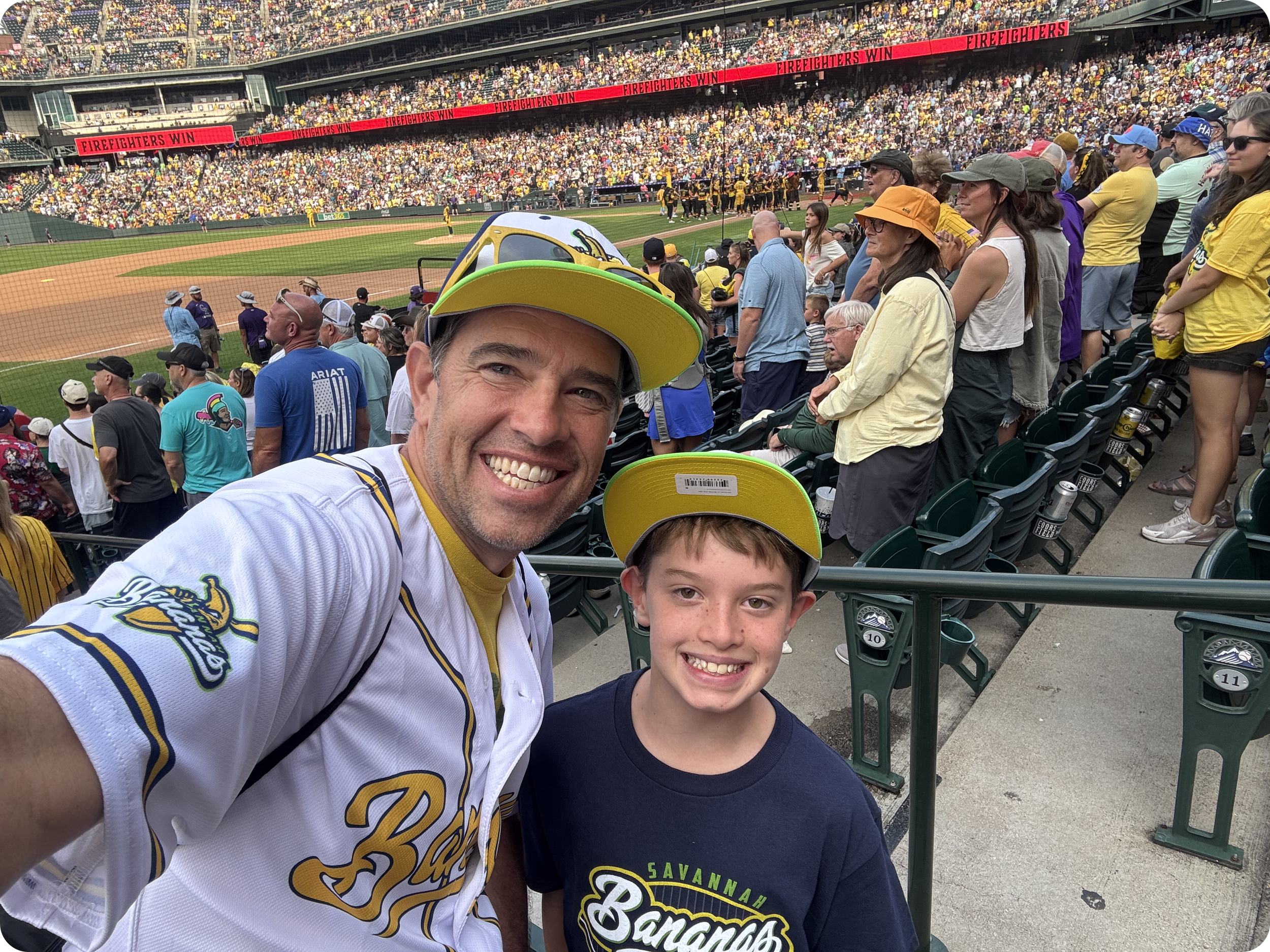 Anthony with his son, Ajay, living it up at the Savanah Bananas game